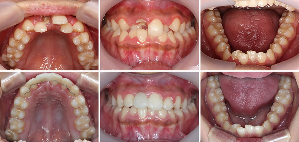 治療が必要な上顎のみ、部分矯正を行い、歯並びをきれいに整えました。折れた前歯はブリッジで治療をするとのことです。